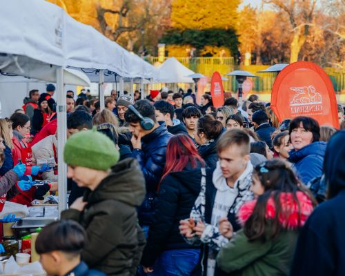 Ahogy megérkeztünk, belecsöppentünk a rendezvényekről már jól ismert kavalkádba. Amint kiosztottuk a feladatokat, megjött az első gyermekcsoport a nevelőivel. Az önkéntesek mind nagyon lelkesek, segítőkészek és mosolygósak voltak. Sorra érkezett a többi gyerekcsapat is. A büfé, melyet az önkéntesek működtettek, nagy sikernek örvendett, tömött sorokban álltak a hot dogért, kínai levesért, csokis kekszért vagy éppen a forró teáért. Az ételeket a segítők frissen készítették össze a gyermekek számára. A pálya nyitásáig a gyerekek kisebb csoportokba verődve eszegettek a melegítők alatt.